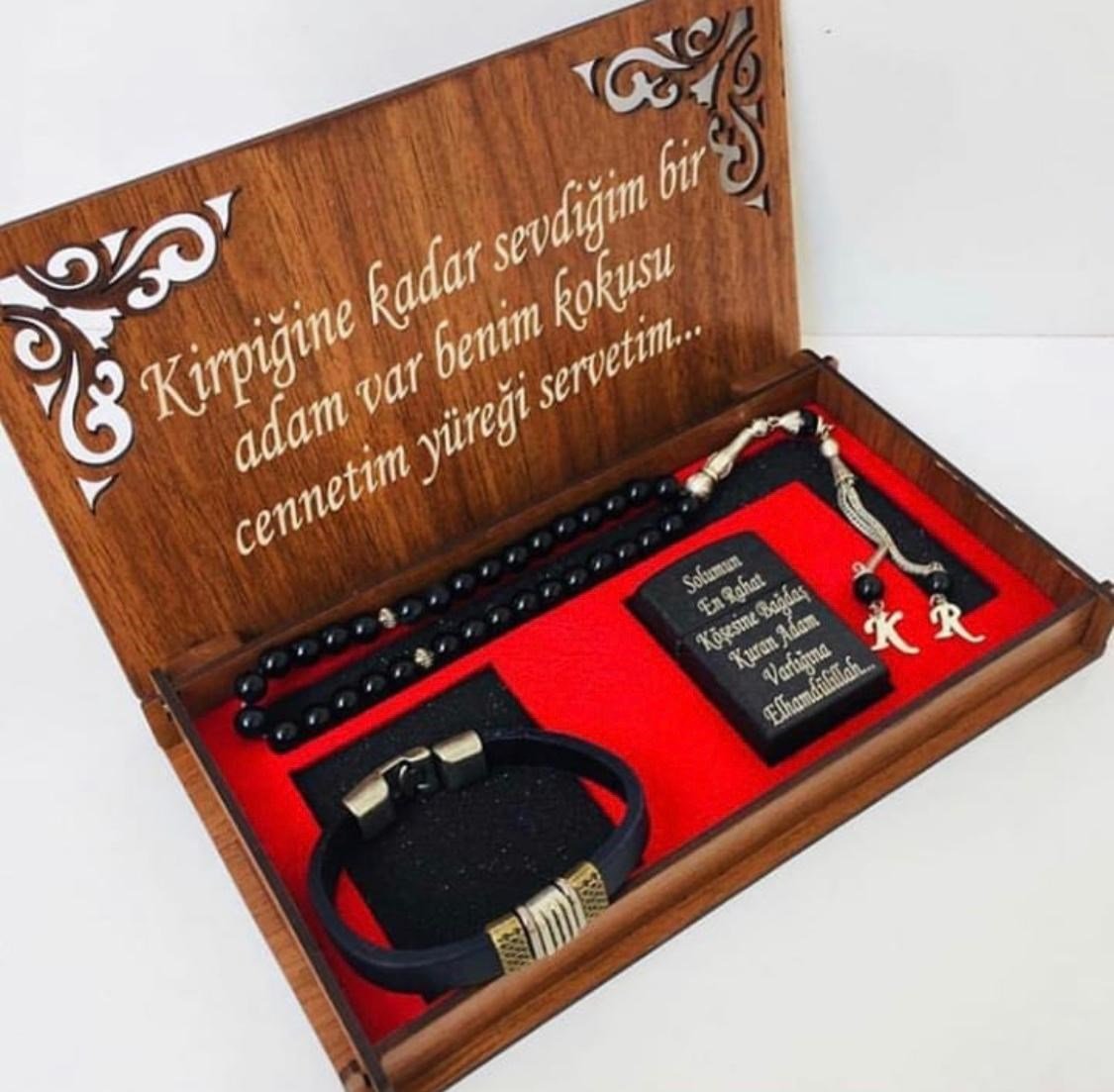 GÜMÜŞ HARFLİ TESBİH SETİ -BİLEKİK -ÇAKMAK BİRLİKTE -AHŞAP KUTU HEDİYELİ