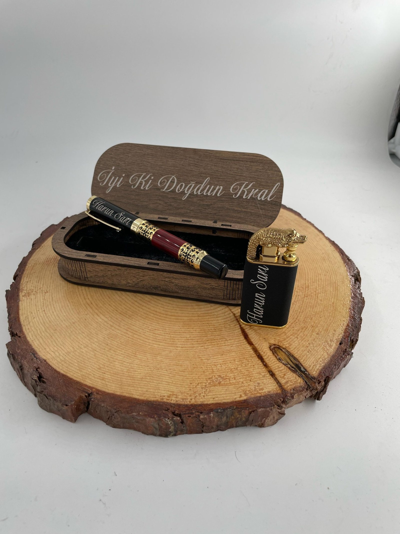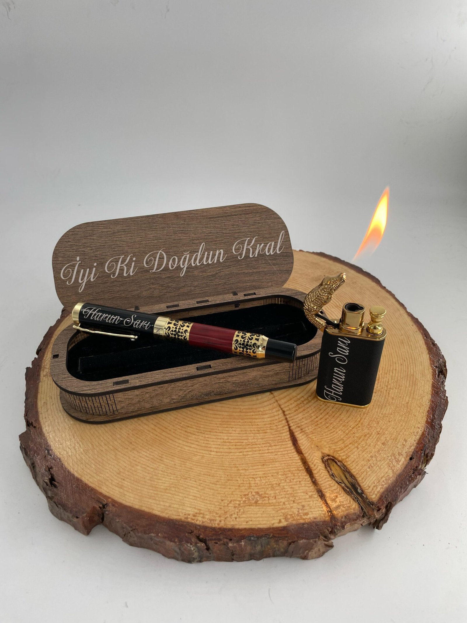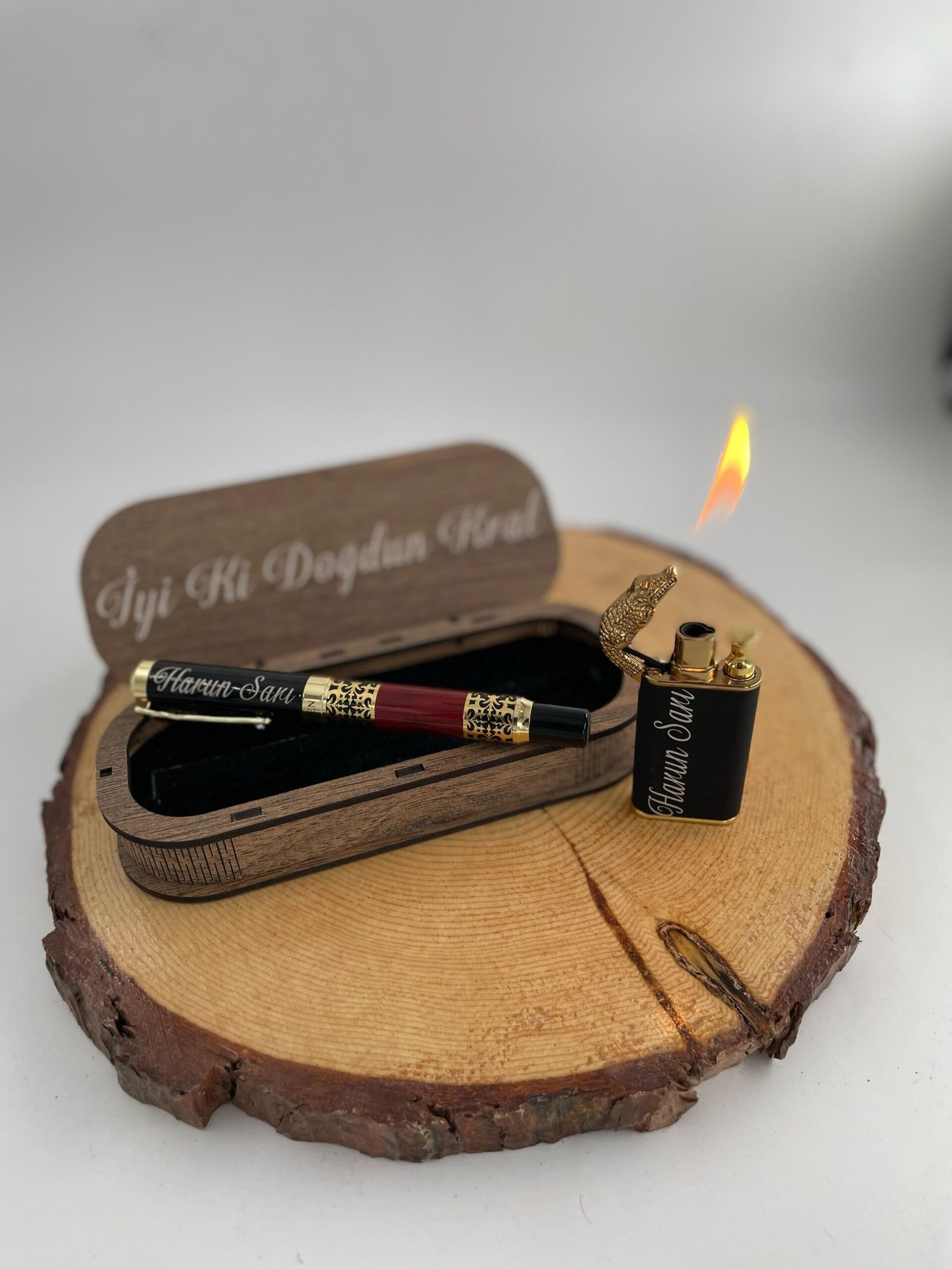 VIP KALEM VE EJDERHA GÖRÜNÜMLÜ ÇİFT REZİDANSLI ÇAKMAK (ÖZEL LAZER KESİM AHŞAP KUTU) HEDİYELİ
